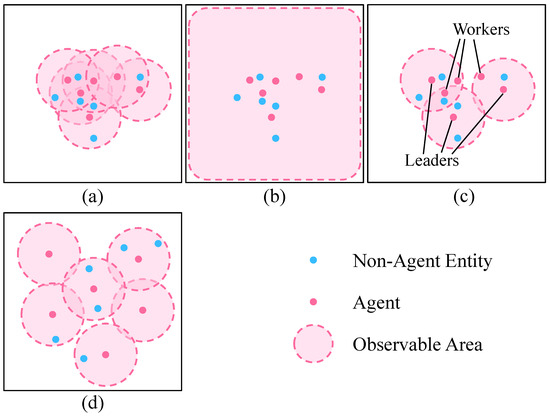 where denotes the set of entities (including agents, obstacles, and targets) in the environment, and the positive integer is the number of entities observed by agent i (we assume that any agent can recognize (and observe) itself). We set if entity is observed by at least one agent; otherwise, . Thus, reflects the degree of overlapping observations and associated redundant computations. Typically, . For instance, values in Figure 1a,c are and , respectively. Moreover, when agents are dispersed, they have fewer overlapping observations and a smaller . Figure 1d shows a special case in which agents have no overlapping observations and their value is For a centralized-executing MAS (Figure 1b), we define because all the observations of agents are aggregated before they are fed into the centralized network.