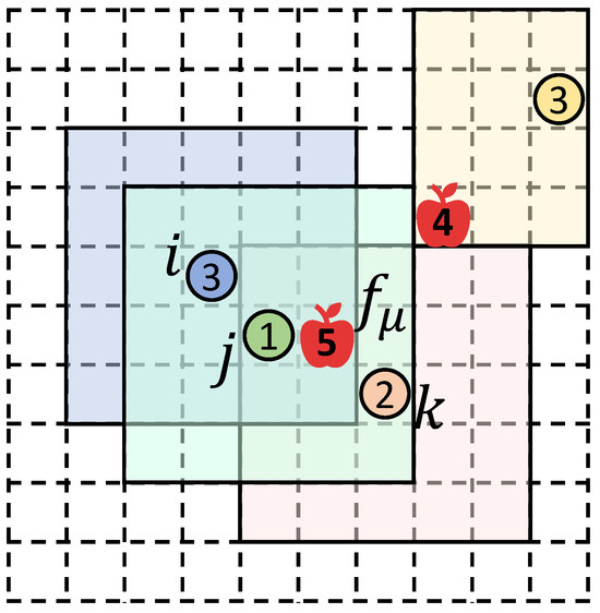At the beginning of the game, () foods and n agents spawn at random locations. Any food has an association level , which indicates the difficulty in obtaining food . Agent i also has its associated level, , indicating the ability of i to obtain food. Figure 2 presents a snapshot of the LBF environment. At each time step t, the agents obtain local observations, communicate with each other, and execute actions selected from . The action space comprises six actions: movement in four directions, a “none” action that means doing nothing, and a “loading” action with which the agent attempts to load the food on the adjacent node. Then, only when the sum of the levels of the agents attempting to collect simultaneously is greater than or equal to the level of , that is, , can they collect, divide, and load it, where denotes the set of agents that performed “loading” simultaneously at its neighbor. Hence, if , agent i cannot collect alone, and its attempt fails. For instance, agent j in Figure 2 will fail if it attempts to collect food at a level of five; thus, it must wait for other agents (e.g., i and k) to come up to the food.