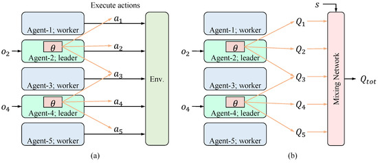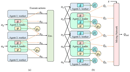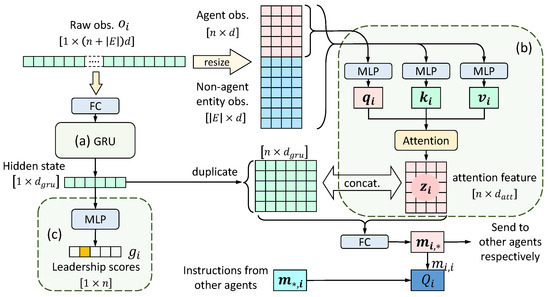 To reduce redundant observations and computations, we enable l () agents, referred to as leaders, to generate instructions for actions for both themselves and other agents, referred to as workers, such that the workers can act on instructions from leaders and be freed from observing their surroundings (so their observations in Equation (3) were excluded), and their actions were determined. The sets of leaders and workers are denoted by and , respectively (where ). The instruction from leader i to worker k is the Q value of k’s possible actions, for observation and .