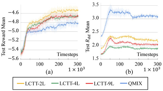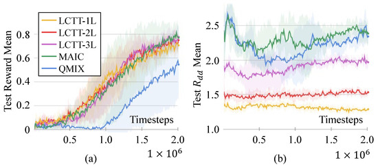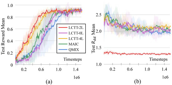 Figure 6a illustrates the mean rewards of LCTT and baselines over timestep in the test phase. All methods achieved similar rewards after convergence; however, LCTT with two leaders, referred to as LCTT-2L, showed the fastest convergence. MAIC allows each agent to generate incentive messages and directly bias the value functions of other agents. MAIC can be considered a special case of LCTT in which ; that is, all agents are leaders and can mutually instruct others. LCTT-4L converged faster than MAIC probably because we used T-Trans rather than teammate modeling to generate messages, and T-Trans does not require explicit modeling or an additional loss functions. QMIX is a frequently used learning method based on CTDE and is the basis of LCTT and MAIC, in which agents make decisions based only on their own observations without communication. QMIX can be considered as a special case of LCTT in which ; that is, all agents are workers. Thus, they determine their actions individually, without relying on T-Trans. Figure 6a shows that LCTT-0L converged faster than QMIX, indicating that T-Trans can learn better than naive MLP networks. We omitted the curves of LCTT-1L and LCTT-3L for the readability of Figure 6. They both converge faster than MAIC but slower than LCTT-2L.