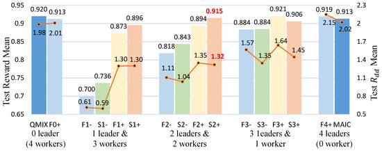 Figure 7 shows the mean rewards and redundant observation ratios of QMIX, MAIC, and ablation versions of LCTT with different numbers of leaders after convergence. According to the numbers of leaders, these 16 algorithms can be classified into five groups (0 leaders, 1 leader, and 3 workers). QMIX, F, F, and MAIC achieved similar performance with large rewards and high redundant observation ratios. In contrast, the LCTT with can obviously reduce redundant observation ratios. Comparing the respective algorithms of the groups with 1, 2, and 3 leaders, generally, fewer leaders lead to lower redundant observation ratios but also result in smaller rewards; for instance, F, F, and F achieved rewards of , , and , with redundant observation ratios of , , and , respectively. We believe that S shows the best performance; it achieved relatively low redundant observation ratios without causing a reduction in rewards.