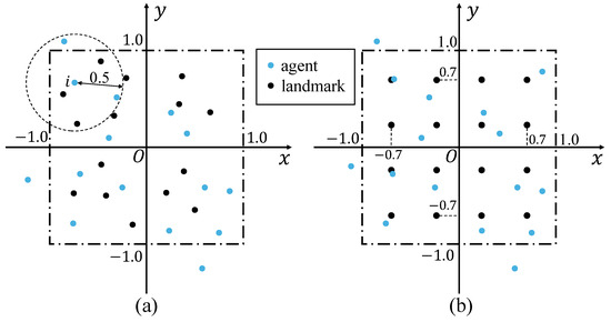 (a) A CN environment. Agents cover landmarks without collision. Agents have visible ranges with radius of 0.5. (b) A manually set CN environment for analyzing the behaviors of leader agents. Landmarks are arranged in a square array.
