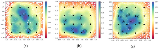 Heat maps of locations of LCTT leaders. (a) Leader locations of LCTT-2L. (b) Leader locations of LCTT-4L. (c) Leader locations of LCTT-9L.