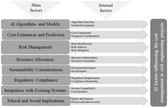 Several factors are crucial in managing cost-related issues in civil engineering projects. In this study, “AI factors” refer to various aspects of AI technology that can influence the cost management practices in these projects. These factors encompass different AI technologies, methodologies, strategies, or considerations that affect how cost management is conducted, optimized, and improved. The importance of these critical AI parameters in cost management lies in their ability to enhance decision-making, optimize resource allocation, and increase project efficiency [41,45]. After several in-person meetings, the panel identified 17 AI factors that significantly influence cost management in civil engineering, which were further categorized into eight groups, as shown in Figure 1. Understanding these factors is essential because they guide the optimization of cost management practices in civil engineering. Here is the list of the selected factors and their relevance to cost management in civil engineering projects: