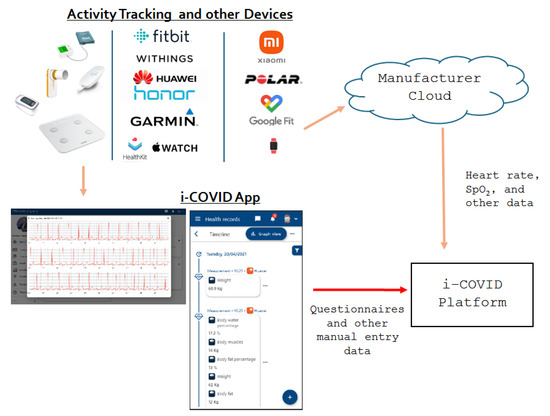 The i-COVID platform utilises several information retrieval techniques to handle health data effectively and to deliver accurate information to HCPs and patients. This health data retrieval functionality has two aspects: (a) application-level integration, where the system communicates with sensors, such as oximeters, spirometers, blood pressure measurement devices, etc. via Bluetooth; (b) platform-level integration, where the acquisition of measurements takes place via services from the cloud platforms of the device manufacturers, such as AppleWatch, Fitbit, Garmin, Polar, Withings, etc. Both approaches follow well-established standards, and data aggregation and federation mechanisms were in place to address the respective data harmonisation challenges. These challenges are not only related to the different data formats, models, and vocabularies but, most importantly, to the nature of the retrieved data with different granularities varying from single measurements to continuous time series and aggregated data on the manufactures’ platforms. Figure 2 presents the data flow of the system employed.