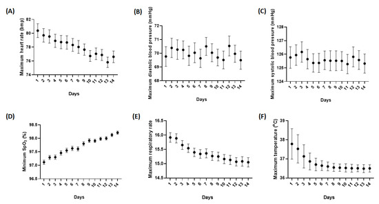 Vital signs were measured daily for the 14-day monitoring period. The mean and standard error mean (SEM) of 162 enrolled patients are shown over the monitoring period. (A) Heart rate, (B) diastolic blood pressure, (C) systolic blood pressure, (D) oxygen saturation levels (SpO2), (E) respiratory rate, and (F) body temperature.The worst measurement over 24 h was used.