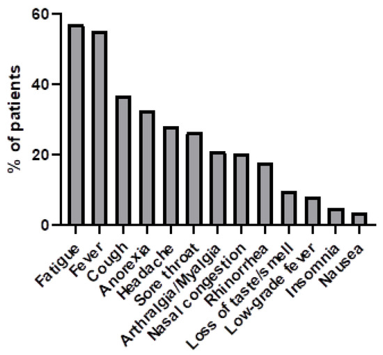 An outbreak of acute respiratory syndrome emerged in humans in Wuhan, China, on 12 December 2019. The causative virus was subsequently identified and named severe acute respiratory syndrome coronavirus 2 (SARS-CoV-2), and human-to-human transmission was confirmed. On 11 March 2020, the World Health Organization (WHO) declared the outbreak of SARS-CoV-2 as a pandemic [1]. Individuals infected with SARS-CoV-2 developed coronavirus disease 2019 (COVID-19), leading to elevated rates of hospitalisation and admission to intensive care units (ICUs) [2]. This new disease imposed an overwhelming burden on healthcare infrastructures. The range of COVID-19 infection severity spans from mild symptoms affecting the upper respiratory tract to severe pneumonia, necessitating intensive care unit (ICU) treatment due to respiratory failure. Most COVID-19 cases suffer from mild symptoms and can be managed in an outpatient setting; however, approximately 5–15% deteriorate and require hospitalisation for treatment, with advanced age and underlying health conditions amplifying the likelihood of severe illness [3]. The median duration from initial symptom onset to the severe stages is estimated to be around 8 days [2,4]. Even though COVID-19 outpatients account for up to 80%, their clinical characteristics and symptomatology are much less documented compared to ICU and non-ICU hospitalised patients.