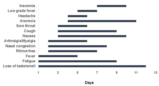 Loss of taste and smell, fatigue, and fever were the first symptoms experienced by the patients. These were followed by rhinorrhoea, nasal congestion, and arthralgia/myalgia. All symptoms appeared in the first week of monitoring, apart from insomnia, whose onset was in the second week of the monitoring period. Loss of taste and smell (N = 16) was the longest-lasting symptom [11 (7–16)], followed by fatigue [9 (6–15)] and anorexia [8 (6–9); N = 53]. In Figure 5, the onset, progression, and duration of symptoms are depicted.