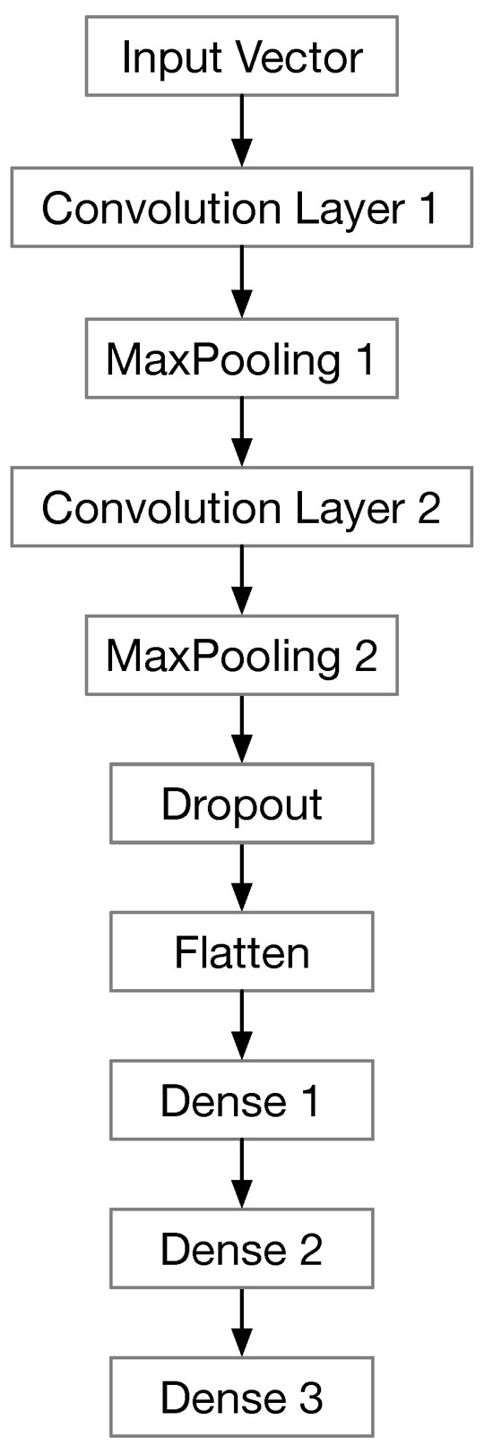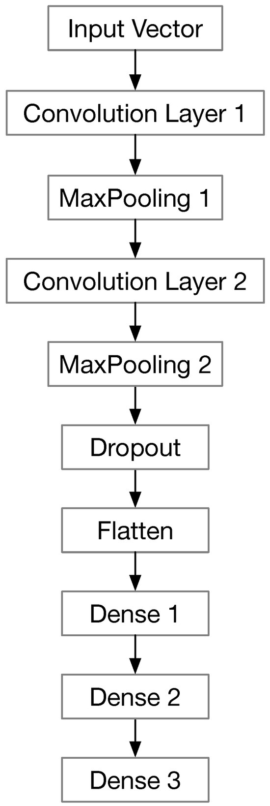 Once the data preprocessing is completed, the vectors are fed into the CNN for feature extraction and classification. The CNN architecture is shown in Figure 2. The CNN layers are described as following: