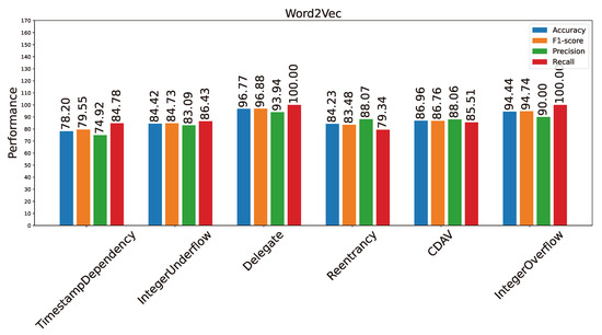 The vulnerability detection performance using the Word2Vec input is shown in Figure 3 and Table 2. Among the six types of vulnerability, delegate and integer overflow have the highest detection performance. For the delegate vulnerability, both the accuracy and F1 score are higher than 96%. For the integer overflow vulnerability, both the accuracy and F1 score are higher than 94%. Furthermore, for both types of vulnerability, the recall is perfect, meaning that all vulnerabilities in the testing dataset have been identified. Hence, this input type made some false negative predictions. The detection performance for the CDAV, integer underflow, and re-entrancy lies in the second tier at 84–87% accuracy and F1 score range. The timestamp dependency is the most difficult to detect, with accuracy, precision, and recall all below 80% (only the recall is higher than 80%). It is interesting to note that, for all types of vulnerability, recall is higher than precision, meaning that there are more false positives than false negatives (if any).