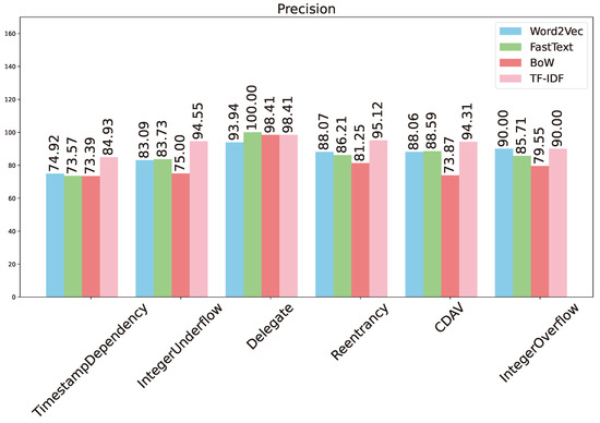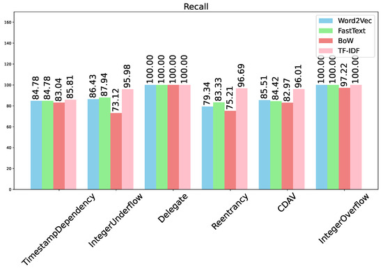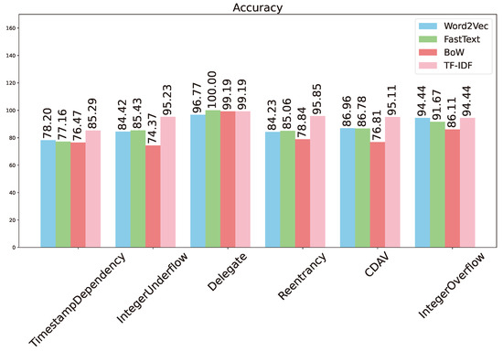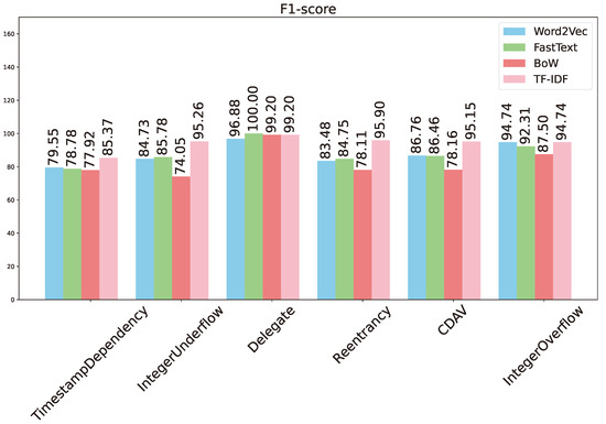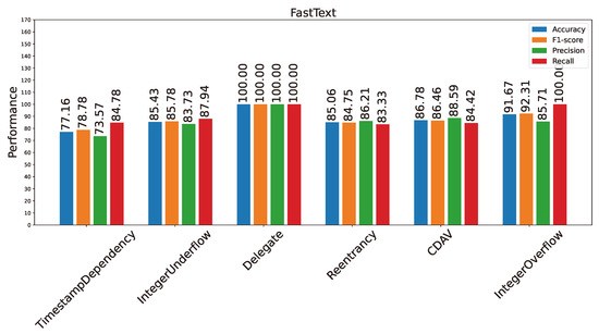 The vulnerability detection performance is summarized in Figure 4 and Table 3. As can be seen, all four metrics (accuracy, precision, recall, and F1 score) are perfect at 100% for detection of the delegate vulnerability. The detection performance for integer overflow comes next with a perfect recall and accuracy of 91.67%. The presence of false positives reduces the precision, similar to the situation for Word2Vec. Again, the detection performance for CDAV, integer underflow, and re-entrancy is similar with accuracy in the range of 85–87%, and F1 score in the range of 84–87%. The detection performance for timestamp dependency comes last, with accuracy and F1 score below 80%. The overall trend for FastText is rather similar to that of Word2Vec.