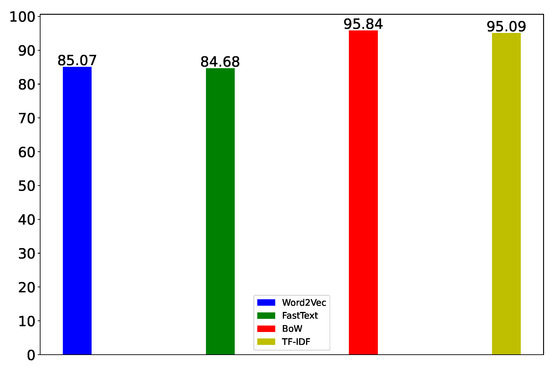 The second overall best performer is FastText. Word2Vec comes in a close third, and BoW has the worst performance. Considering that FastText is based on Word2Vec and is an improvement over Word2Vec, it is expected that FastText performs better than Word2Vec. More specifically, FastText could handle morphologically rich languages by adding sub-word information, which enables FastText to capture variations in word structure and semantics, which improves its performance in specific contexts.