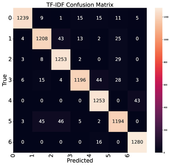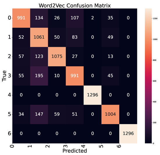 The vulnerability detection overall accuracy for the four types of input is summarized in Figure 11. The overall accuracy is calculated as the fraction of correctly classified samples with respect to all the samples in the test set. As we can see in Figure 11, although TF-IDF still has good performance (at 95.09%), BoW actually has the highest accuracy at 95.84%. Word2Vec comes as the third best performer at 85.07%, while FastText performs in the last place at 84.68%. This is significantly different from the results in binary classification. To understand the details of multiclass classification, it is necessary to inspect the confusion matrix [33] for each type of input, which is shown in Figure 12, Figure 13, Figure 14, and Figure 15, respectively.