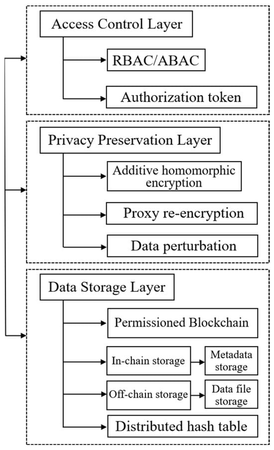 In this work, we propose a three-layer blockchain-based framework for B2B data sharing. As illustrated in Figure 1, the structure comprises a data storage layer for secure data handling, a privacy preservation layer ensuring data privacy through advanced encryption, and an access control layer for dynamic permission management, offering a comprehensive solution for secure and efficient business data exchange.