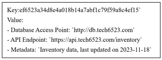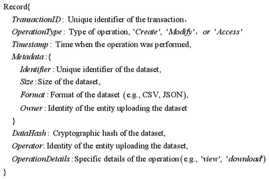 When new data are created and uploaded to the platform, their metadata (e.g., file size, format, and time of creation) and the hash value of the data are recorded on the blockchain. The hash value is generated by applying a cryptographic hash function to the data content, which provides a unique digital fingerprint of the data. This hash value plays a key role in the data lifecycle and is used to verify that the data have not been tampered with. If the data are modified, the specific details of the modification (including the modification time and the identity of the modifier) and the hash value after modification will be recorded. In this way, any change to the data will leave an immutable trace, guaranteeing the historical traceability of the data. This is important to the data integrity of B2B data sharing. Whenever data are accessed, the time of access, the identity of the visitor, and the nature of the access (e.g., viewed or downloaded) are recorded. This provides transparency of data usage and facilitates monitoring and auditing. A standard metadata will have the following structure (Figure 3):