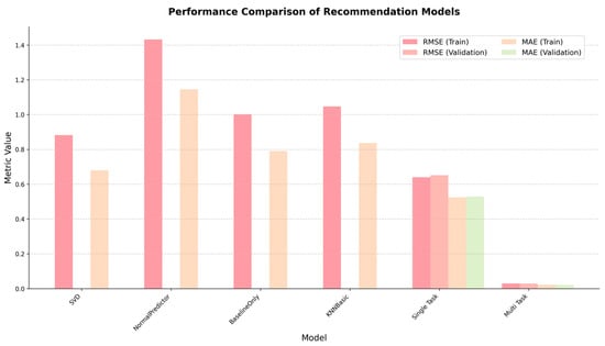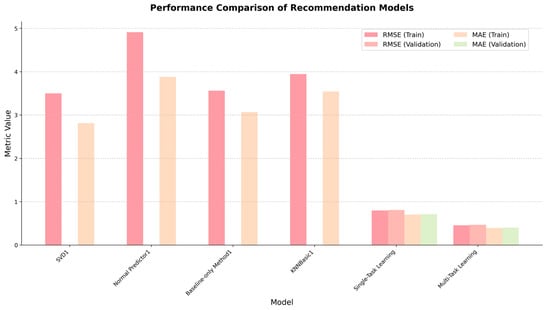 | Metric Value | Data | SVD 1 | Normal Predictor 1 | Baseline-Only Method 1 | KNNBasic 1 | Single-Task Learning | Multi-Task Learning |