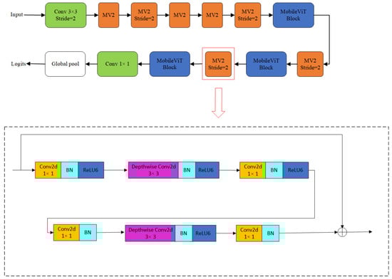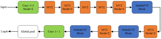 In view of the above problems, Reference [] used the hybrid architecture of CNN and Vision Transformer, MobileViT, which combines the advantages of a convolutional neural network and Vision Transformer, trying to solve the problem that a convolutional neural network lacks global information when dealing with complex images and the problem of Vision Transformer in computational efficiency. When using CNN to process image data, CNN usually extracts different features at different levels to capture local and global information. When using Vision Transformer to process sequence data, the Vision Transformer utilizes the attention mechanism to capture dependencies between positions in the sequence, enabling improved understanding and processing of input data. Therefore, combining CNN and Vision Transformer can better capture the global and local information in the data. Combining them can combine their respective advantages, thus enhancing the precision of the model. Mobile ViT achieves the goal of improving model accuracy while maintaining high computational efficiency.The structure of MobileViT is shown in Figure 3.
