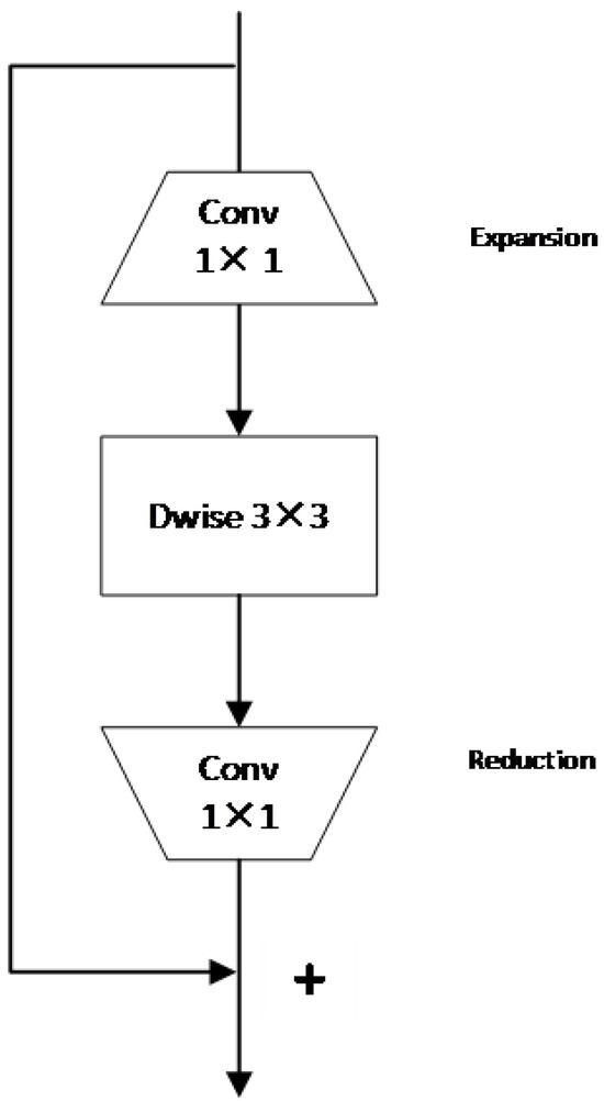 Howard et al. proposed MobileNet V1 []; in this process, the depthwise separable convolution is applied to split the standard convolution operation. Specifically, deep separable convolution can be divided into two operations: deep convolution and pointwise convolution. Deep convolution uses a unique convolution kernel for each input channel, ensuring that each channel only interacts with the corresponding convolution kernel, so as to realize the convolution operation of channel decomposition. Pointwise convolution is a standard convolution operation, in which the size of the convolution kernel is 1 × 1, which acts on all channels of the input and aims to fuse features from different channels. Compared with V1, MobileV2 [] was proposed by Google in 2018 and introduces a reverted residual structure, which makes the model better able to learn complex features, greatly improves performance, and optimizes the complexity of the model. Simultaneously, MV2 also introduces linear bottleneck and cascaded point-by-point convolution techniques, which help the model to use input information more effectively. The block structure in MV2 is an inverted residual structure, which is shown in Figure 1.