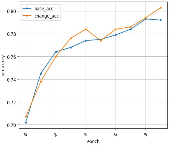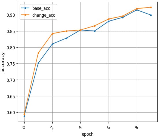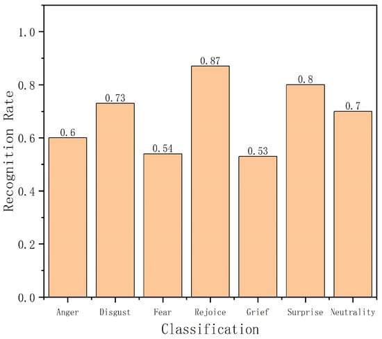 To assess the efficacy of the network devised in this article for improving expression recognition performance, we conducted a comparative analysis of the RaFD database before and after enhancing the base network. Our results, presented in line graphs, demonstrate the superiority of the improved network. As shown in Figure 7, a broken line is formed in the loss function of each epoch training, which can be seen by comparing the basic network with the improved network. The improved network exhibits a lower loss function profile while possessing a faster convergence rate. The recognition rate curve in the training process can be clearly seen in Figure 8. According to the results in Table 1, based on the experimental results, it can be concluded that the basic MobileNetViT network has a correct recognition rate of 91.5% in the RaFD database. Furthermore, the addition of the improved MV2 structure increases the correct recognition rate of the network to 92.30%. Through the comparison of the same parameter settings, it can be found that the facial expression recognition rate of adding the improved MV2 structure is nearly 0.8% higher than that of the basic network. This sufficiently demonstrates that the network structure that has been designed in this article has a significant effect in improving the performance of facial partially occluded expression recognition. Through Figure 9, from the experimental results, the identification rate of the improved network for each type of expression in the RaFD database can be observed.