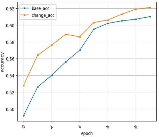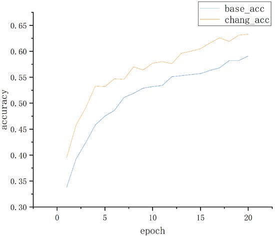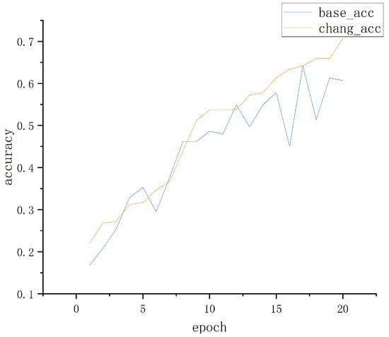 In order to verify the robustness and versatility of the improved MobileViT network, the number of training epoch was increased to 20 under the same experimental conditions to show the comparison between the improved network and the original network with the increase in the number of training epochs. The experiment was tested on the JAFFE dataset and the MMAFEDB dataset. The JAFFE dataset contains a total of 213 facial expression pictures of six types provided by Jaffe, and the MMAFEDB dataset contains facial expression images and videos from Asian participants, which is a multimodal Asian facial expression dataset. Figure 16 and Figure 17 show the performance of the improved MobileViT network and the original MobileViT network on the JAFFE dataset, respectively.