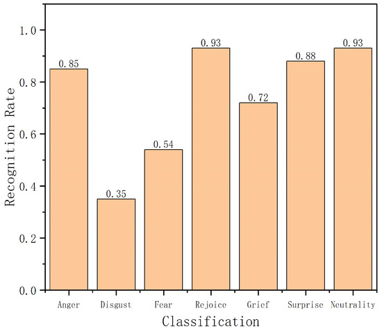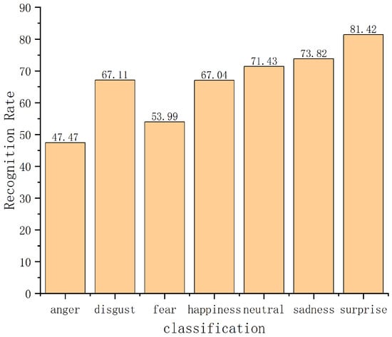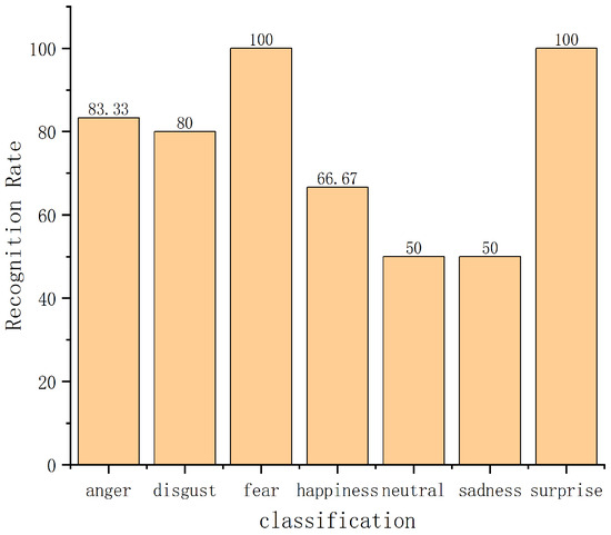 Through the comparative experimental analysis of the basic network before and after adding the improved MV2 structure, the recognition rate of the improved network has been improved. Figure 14 and Figure 15 show the recognition rate of each type of expression on the two databases of the improved network.