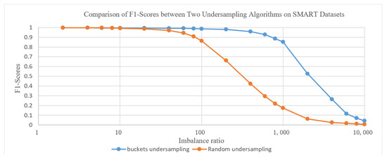 Figure 2 shows the comparison of F1 values between bucket undersampling and random undersampling algorithms on SMART datasets with different balance ratios. As the imbalance ratio increases, the F1 value of bucket undersampling is significantly higher than that of random undersampling.
