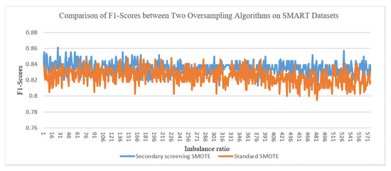 Comparison of F1-scores between two oversampling algorithms on SMART datasets.