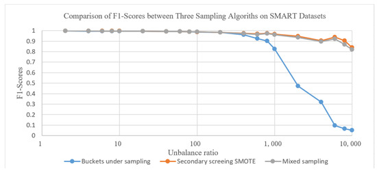 Comparison of F1-scores between three sampling algorithms on SMART datasets.