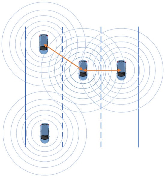 Vehicle communication. First, each vehicle broadcasts data in a V2X communication model (blue circles). Depending on the computed distance between two vehicles, they can start V2V communication (orange arrows).