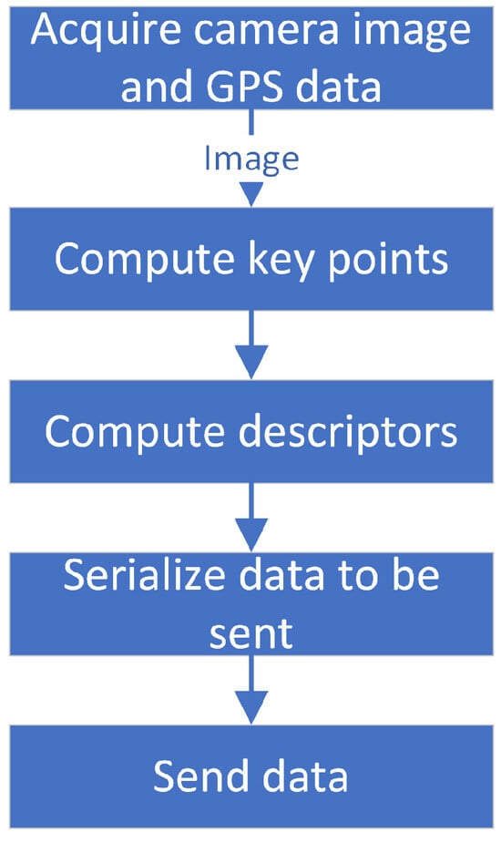 After establishing that the two vehicles are close enough and that image data has to be sent between them, the next question to be answered is exactly which data should be exchanged. Sending the entire video stream is unfeasible due to high bandwidth requirements, so the most straightforward approach is to compute key points for each frame. Then, for each detected key point, a descriptor is computed. All these steps are presented in the flowchart illustrated in Figure 2. Once the descriptors have been computed, every piece of information related to the current frame is serialized and sent to other paired vehicles. This includes the timestamp, latitude, longitude, speed, key points, and descriptors.