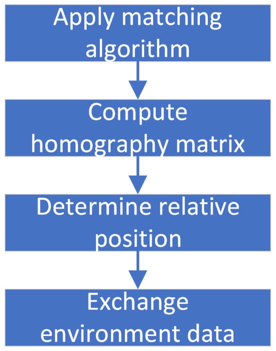 Each vehicle will also have its own video stream that is processed locally. This means that, for each frame, the key points and their descriptors are computed. These will have to be matched against the key points and descriptors received from other vehicles. There are various algorithms developed for feature matching, but the most used ones are brute-force matcher (BFMatcher) [39] and fast library for approximate nearest neighbors (FLANN) [40]. Brute-force matcher matches one feature descriptor from the first set with all features in the second set using distance computation to find the closest match. FLANN is an optimized library for fast nearest neighbor search in large datasets and high dimensional features, which works faster than BFMatcher for large datasets and requires two dictionaries specifying the algorithm and its related parameters.
