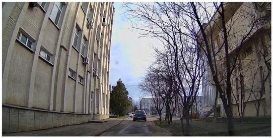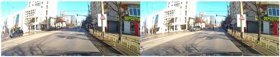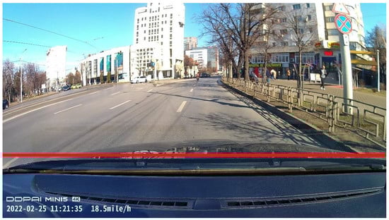 Considering that the camera captures a significant part of the car dashboard (see, for example, Figure 4), this aspect can negatively influence the image-matching algorithm. It is important to note that this particular area is not relevant for the intended purposes. Furthermore, in that area, information from the camera is displayed, such as the camera name, current date, and speed. These elements can also affect the performance of the used image descriptors. For this reason, the decision was made to crop out the respective area from the original image, thus eliminating irrelevant information and retaining only the essential data for the intended purposes. The cropped area corresponds to the region beneath the red line in Figure 4, and this approach enables greater precision in image matching and enhances the algorithm’s performance regarding the specific intended objectives.
