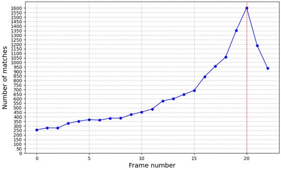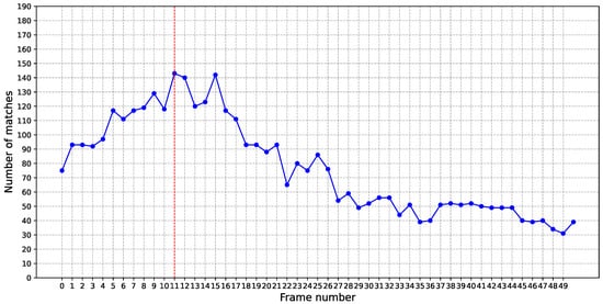 In the conducted tests, we observed that for certain areas captured in the images, such as in Figure 12, the proposed algorithm detected very few matches between frames from the two cameras. This compromised the optimal functioning of the corresponding frame detection algorithm. As depicted in Figure 13, for frame 11, which should ideally have the highest number of matches, they amounted to only around 150. Due to the low number of matches, the algorithm fails to accurately identify the correct frame.