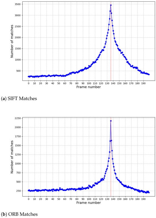 Implementing this algorithm involved monitoring the number of matches for each frame and retaining the frame with the most matches. An essential aspect was identifying two consecutive decreases in the number of matches, at which point the frame with the highest number of matches up to that point was considered the corresponding frame.