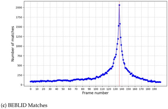 When received information about a frame is searched in a video, the closer it gets to the corresponding frame, the higher the number of matches increases (as observed in Figure 5). Essentially, the closer the current vehicle gets to the position where that frame was captured, the more similar the images become. With some exceptions that will be discussed at the end of the paper, this approach proved valid during all our tests.