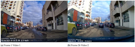 We did this two times, the only difference being that we switched the car order. The frames detected were in the same area for both cases. The results are presented in Table 7 and in Table 8. In these tables, we included the frame from the first video (from the car in front), the detected frame in the video from the car behind, the computed distance relying solely on the GPS coordinates, the distance computed by the proposed algorithm, and the real measured distance.