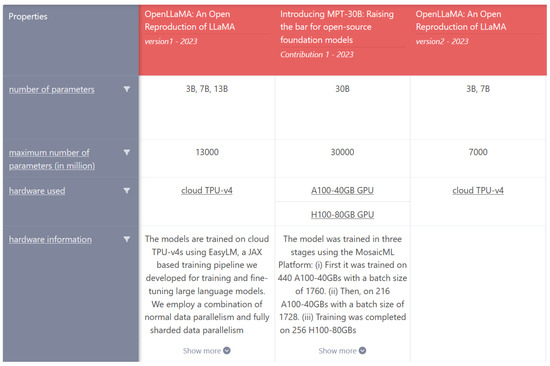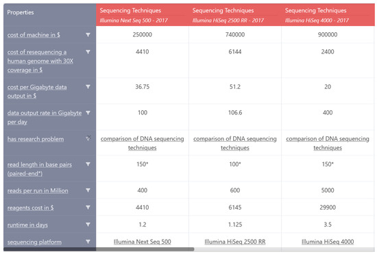 One notable initiative aimed at publishing structured representations of scientific papers is the Open Research Knowledge Graph (ORKG, https://orkg.org/ accessed on 23 April 2024) [2]. The ORKG endeavors to describe papers in terms of various research dimensions or properties. Furthermore, a distinguishing characteristic of the properties is that they are also generically applicable across various contributions on the same problem, thus making the structured paper descriptions comparable. We illustrate this with two examples. For instance, the properties “model family”, “pretraining architecture”, “number of parameters”, “hardware used”, etc., can be effectively applied to offer structured, machine-actionable summaries of research contributions on the research problem “transformer model” in the domain of Computer Science (Figure 1). Thus, these properties can be explicitly stated as research comparison properties. As another example, papers with the research problem “DNA sequencing techniques” in the domain of Biology can be described as structured summaries based on the following properties: “sequencing platform”, “read length in base pairs”, “reagents cost”, and “runtime in days” (Figure 2). This type of paper description provides a structured framework for understanding and contextualizing research findings.