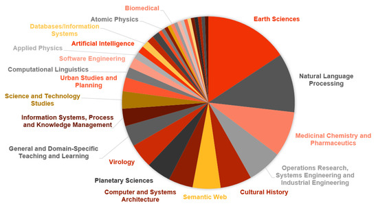 As alluded to in the Introduction, answering the central RQ of this work requires comparing the research dimensions generated by three different LLMs with the human-annotated research comparison properties in the ORKG. For this, we created an evaluation dataset of annotated research dimensions based on the ORKG. As a starting point, we curated a selection of ORKG Comparisons from https://orkg.org/comparisons (accessed on 23 April 2024) that were created by experienced ORKG users. These users had varied research backgrounds. The selection criteria for comparisons from these users were as follows: the comparisons had to have at least 3 properties and contain at least 5 contributions, since we wanted to ensure that the properties were not too sparse a representation of a research problem but were those that generically reflected a research comparison over several works. Upon the application of these criteria, the resulting dataset comprised 103 ORKG Comparisons. These selected gold-standard comparisons contained 1317 papers from 35 different research fields addressing over 150 distinct research problems. The gold-standard dataset can be downloaded from the Leibniz University Data Repository at https://doi.org/10.25835/6oyn9d1n (accessed on 23 April 2024). The selection of comparisons ensured the diversity of the research fields’ distribution, comprising Earth Sciences, Natural Language Processing, Medicinal Chemistry and Pharmaceutics, Operations Research, Systems Engineering, Cultural History, Semantic Web, and others. See Figure 3 for the full distribution of research fields in our dataset.