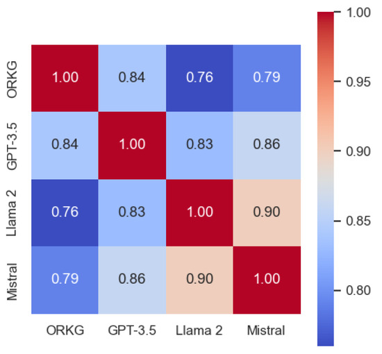 Furthermore, the correlation heatmap (Figure 7) provides a visual representation of these similarities, highlighting the strongest correlations between ORKG properties and LLM-generated dimensions. The embedding-based evaluations indicate that GPT-3.5 demonstrates the highest similarity to the ORKG properties, outperforming both Llama 2 and Mistral. When comparing LLM-generated dimensions between these models, the strong similarity observed between the Llama 2 and Mistral dimensions highlights the remarkable consistency in the research dimensions generated by these two models.