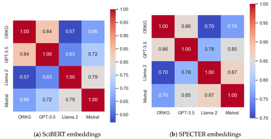 To further validate our findings, we extended our evaluations using SciBERT and SPECTER embeddings in addition to SciNCL. These additional embeddings provided similar results, reinforcing the reliability of our conclusions. Specifically, using SPECTER embeddings, the cosine similarity between the ORKG properties and the LLM-generated dimensions was 0.86 for GPT-3.5, 0.70 for Llama 2, and 0.76 for Mistral. With SciBERT embeddings, the cosine similarity values were 0.84 for GPT-3.5, 0.57 for Llama 2, and 0.66 for Mistral (Figure 8). These consistent results across different embedding models highlight the robustness of the LLMs’ capacity to generate research dimensions that are semantically aligned with the manually curated ORKG properties.