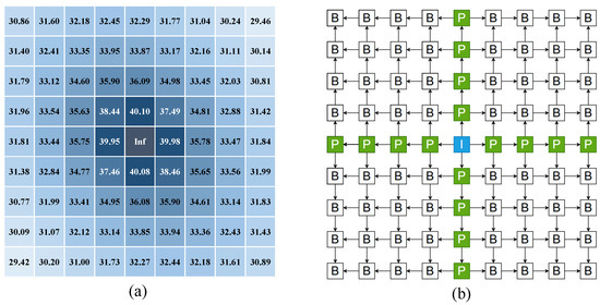 Step 2: I-view has no reference, the P-reference is the other P-views that is close to I-view in the same direction as itself, and the reference of the four P-views adjacent to the I-view is naturally I-view. In B-view, we choose two adjacent views in the direction of I-view as the pre-selection reference, but only select the one with the higher PSNR value, as shown in Figure 2b.