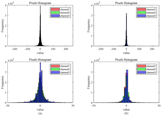 For coding residual views, this paper introduces two schemes in this paper: lossless coding and lossy coding. Using two distinct light-field scenes: “medieval” and “corner”, they come from two different LF multi-view datasets with different resolutions, including different environments, objects, light conditions, and occlusion levels. The number of pixels in the three color channels of the residual pixel matrix is calculated by applying the previously proposed prediction structure for difference processing. The resulting histogram in Figure 4 reveals that most pixel values are close to 0, with minimal occurrences near −255 or 255. In order to minimize the number of bits used, a DC coding scheme is adopted, and the specific coding principle is illustrated in Table 1. The coding process is given by Algorithm 1.