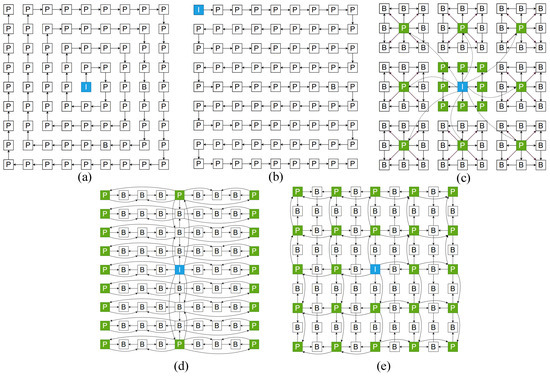 Step 1: All views are divided into three groups: the central view is designated as the I-view (blue), views in the horizontal and vertical directions of the I-view form the P-view (green), and the remaining views constitute the B-view (white).
