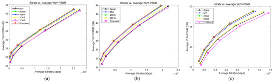 According to the suggestions and structure of Figure 6a–e, differences in each channel of the “medieval”, “kitchen”, and “boardgame” views were initially preprocessed. Then, the difference between the three channels is combined to form several difference views, and the video sequence required for HEVC is synthesized (Y:U:V = 4:2:0). Specifically, we take QP = 17, 22, 27, 32, 37 and encode the three difference sequences separately, and the final result is shown in Figure 7. In HEVC, the QP value is a quantization parameter that determines the bitrate. From the perspective of the rate-of-distortion curve, the processed image in this paper has better bit-saving performance and has better quality gain at both lower and higher bitrates (Figure 8).