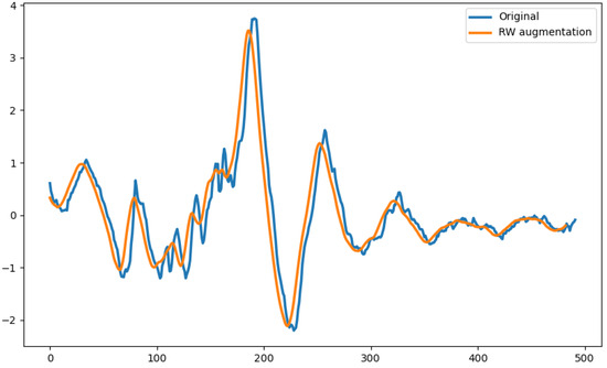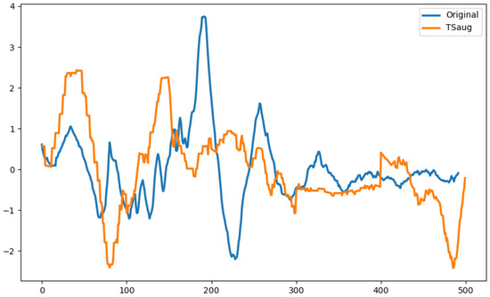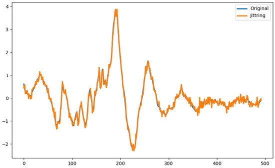 - Jittering: This is a process of introducing noise to time series. It is an example of a transformation-based data-augmentation method that is both straightforward and efficient. Equation (1) represents mathematical notation of jittering.where belongs to Gaussian noise (N) injected to each time step t and . The standard deviation is set to 0.1. Figure 5 demonstrates the actual and transformed data after applying jittering on CogAge atomic (bending) activity.