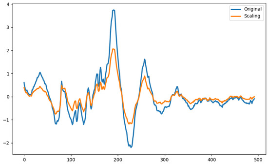 - Scaling: A random scalar number is used in scaling to alter a time series’ global magnitude or intensity. Scaling involves multiplying the scaling parameter by the total time series. Equation (2) represents mathematical notation of scaling.The scaling parameter is selected via a Gaussian distribution (N) with 1.5. Figure 6 demonstrates the actual and transformed data after applying scaling on CogAge atomic (bending) activity.