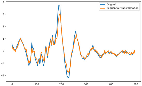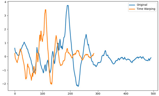 - Time warping: This refers to the process of altering a pattern in the temporal dimension. This task accomplished by employing a seamless distortion trajectory [62,85]. Equation (3) represents the mathematical notation of time warping.Here, denotes a warping function that adjusts the time steps based on a smooth curve. The curve’s smoothness is dictated by a cubic spline with knots . The knot heights are determined from . This transformation manipulates the time axis by compressing or expanding it at various points in the time series, which introduces diversity and enhances the dataset. Figure 7 demonstrates the actual and transformed data after applying time warping on CogAge atomic (bending) activity.