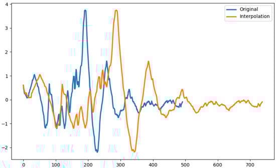 - Linear Interpolation: This calculates new values by fitting a straight line between neighboring data points. The interpolated value between two existing data points and at any time t can be calculated by the Equation (4).where and represent the values of sequences at time and , respectively. Figure 8 demonstrates the actual and transformed data after applying linear interpolation on CogAge atomic (bending) activity.