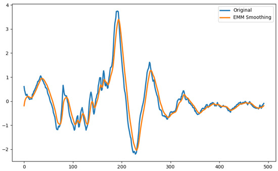 - Exponential Moving Median Smoothing: This provides smooth data by exponentially diminishing weights. To be resistant against outliers, it computes a weighted median rather than a weighted average. Mathematically, it can be expressed by Equation (5).where represents the input data sequence. represents the median function and W represents window size. Figure 9 demonstrates the actual and transformed data after applying smoothing on CogAge atomic (bending) activity.