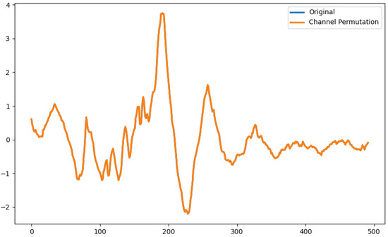 - Channel Permutation: This shuffles the channels (or features) of the complete sequence without changing the values inside each channel. Mathematically, it is represented by Equation (6).X is the rearranged version of the original data, where is a function that changes the order of the channels. This transformation preserves the chronological order of the data but adds diversity by reorganising the channels. Figure 10 demonstrates the actual and transformed data after applying channel permutation on CogAge atomic (bending) activity.